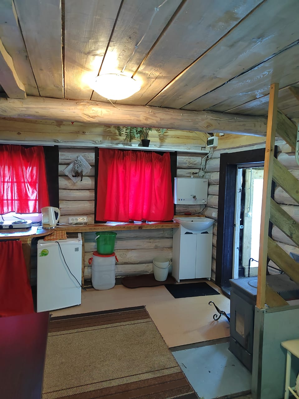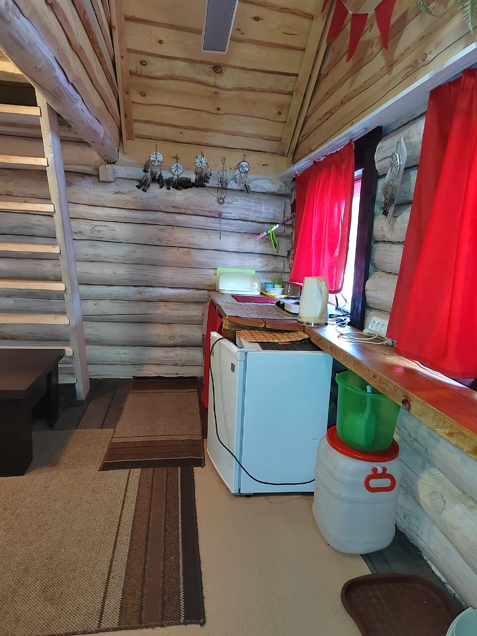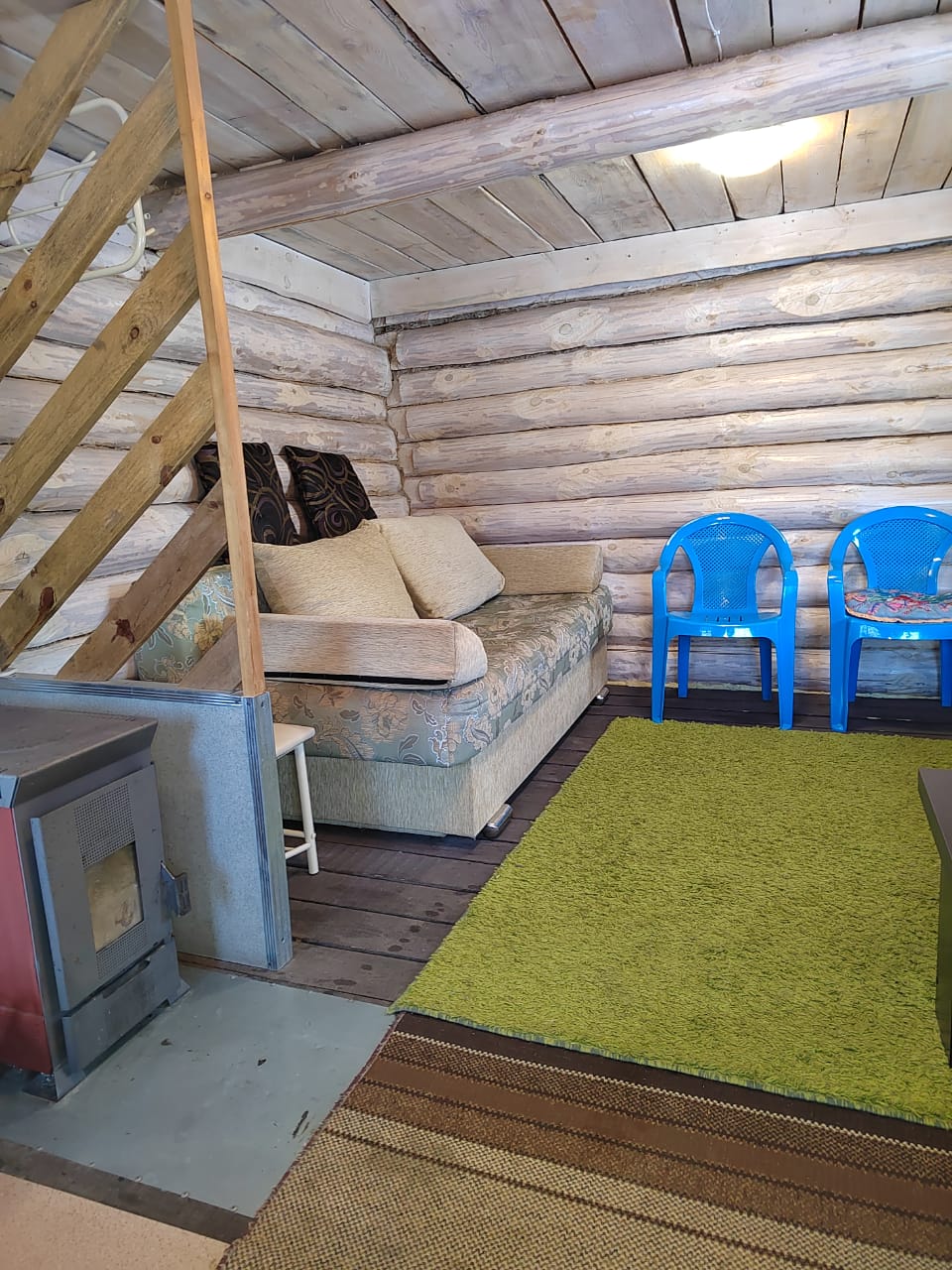 Дом с печкой внутри и вторым мансардным этажом. на первом этаже два дивана, кухонная зона . Дом оборудован всем необходимым для комфортного проживания (посуда, холодильник, чайник, умывальник с подогревом, стол раскладной. В мангальной зоне есть газовая плита, питьевая вода со скважины. Туалет на улице.